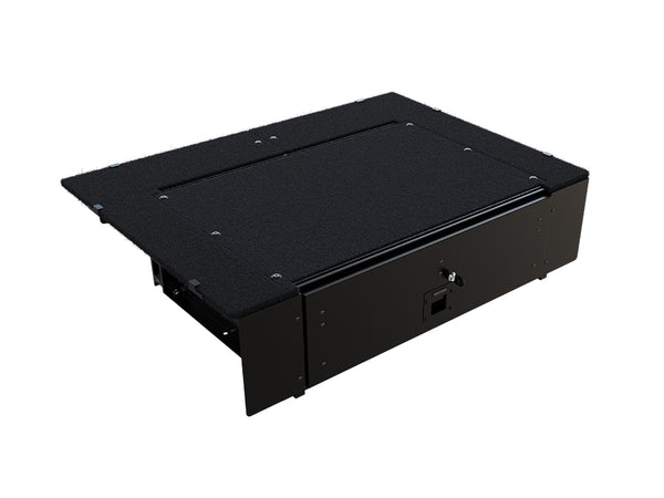 This drawer kit has 1 lockable drawer, 2 keys per lock, 2 tie down rails, 4 tie down rings, deck completion set, face completion set, brackets, all necessary installation hardware, and detailed fitment instructions. 113kg / 250 lb drawer load carrying capacity. Hold open feature: drawer “locks" open while parked on uneven surfaces. High-strength bearing slides allows each drawer to extend nearly 100% from the anchored base. Provide peace of mind and security by locking away important travel items such as computers, smart phones and camera gear. The flat deck incorporates two cargo attachment channels and 4 SSCA047. Customize your own storage configurations. Stack and secure luggage, SBOX031, SBOX001, aluminum boxes and other storage containers to the top deck using STRA034 or other straps. The deck above the drawers can also be used to mount Front Runner Cargo/Fridge Slides. The side decks and rear decks are easily removable creating storage space between the drawers and vehicle for a variety of items such as tools, jumper cables, tow ropes, diving snorkels, masks, fins, kindling, barbeque skewers, etc. The deck is covered with a durable, UV resistant nylon pile black carpet detailed to complement the vehicle’s interior contours. The nylon carpet surface creates resiliency for securing cargo while insulating against noise and vibration. Finished with the same durable black powder coating as Front Runner Roof Racks and other Front Runner products. This drawer kit can be easily installed in minutes by attaching the supplied carabiners and turnbuckles to the vehicle’s existing mounting points and the drawer mounting brackets. Removing the drawer is just as easy. All Front Runner Storage Systems are backed by a 2 year warranty.
