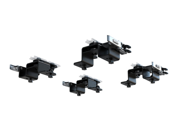 Once these brackets are installed on a Front Runner Rack, no tools are needed to remove or install a roof top tent. Simply release the tabs on the 4 latches and lift the tent away in seconds. No more wrenching in tight spaces during the ‘off-season’ or time-consuming weekday removal of a roof top tent. This strong and rattle-free mounting system is built off-road tough for use with Front Runner Racks. Compatible with the TENT034 and other popular soft shell tent brands like TJM, ARB, Tepui, etc*. Compatible with hard shell tents such as Autohome/Maggionlina, and James Baroud*. Hard shell tent owners please read **IMPORTANT NOTE below. 4 low profile base brackets are bolted to a Front Runner Rack while 4 self-aligning bushes are secured to the tent base channels using the appropriate Tent Channel Set. Secures in place with 4 latches with safety catches. Can be locked using RRAC134 combination cable lock. Certain tent sizes and designs will dictate the height needed to clear the edge of the Front Runner Rack. The brackets are small, unobtrusive and can be left on the roof rack when the tent is not mounted, leaving vast rack space available. No tent modification is required. Removed tents can be stored on the ground, raised slightly off the floor by the supplied steel bushes. Supplied with all required mounting hardware. Fitting instructions are included. TBMK034 or TBMK036 may be required for other tent brands (sold separately). *Soft shell and hard shell tents may need additional Nut Plates, sold separately. **IMPORTANT NOTE: Hard shell tents need additional support. If you are using these brackets with hard shell tents, such as James Baroud or Autohome, and you are unable to position the tent to rest directly on the rack, or the edges of the rack side profiles, use - TBMK009. Depending on the tent manufacturer, your hard shell tent warranty may be voided if your tent becomes damaged and you did not provide proper lateral support for the hard shell tent. Note: Extra Mounting Brackets may be required for some tent and rack combinations which require extra support.