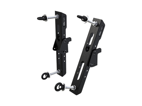These off-road tough brackets securely mount MAXTRAX, TRED Pro and other similar hole spacing recovery devices to the side profile of a Front Runner Slimline II Rack. Also use for mounting the RRAC149 (sold separately). Adjustable in height and angle to compliment various vehicle profiles. Includes 2 types of bolts for holding either 1 or 2 pairs of MAXTRAX/TRED Pro. Built to mount to the side profiles of a Slimline II roof rack but are also compatible with the original Slimline rack. Finished with the same durable, weather resistant black powder coating as the Slimline II Rack. The included bolts can be substituted with the REQU120 (sold separately) to lock MAXTRAX in place. Note: This product is not compatible with Slimsport rack kit range.